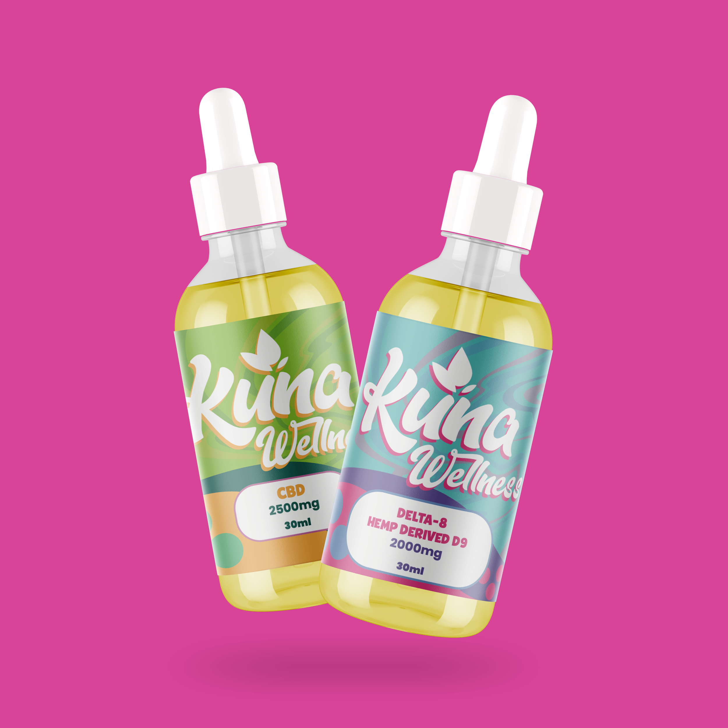 The brand's oil products are distinguished by a series of custom-designed adhesive stickers that serve as the primary product label. These labels are a key element of the packaging, featuring the distinct "Kuna Wellness" logo and brand isotype. Each label uses a different, vibrant color palette to easily differentiate between products and potencies. The design provides all essential information at a glance, including the specific type of oil (Delta-8 or CBD) and its total milligram content. Additionally, each sticker clearly displays recommended directions for use , nutrition facts , and necessary warnings, ensuring customers are fully informed. The use of these cohesive, informational labels reinforces the brand's commitment to transparency and a well-informed customer experience.